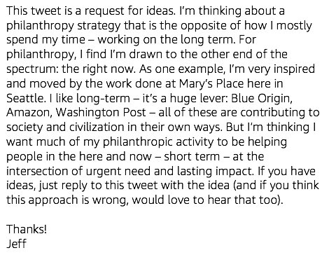 Mr. Bezos wrote<http://action.everylibrary.org/r?u=https%3A%2F%2Ftwitter.com%2FEveryLibrary%2Fstatus%2F875777634453639169&e=2673d625b79ee07495c1ec13576ef1fa&utm_source=votelibraries&utm_medium=email&utm_campaign=jeffbezos&n=6>, “I’m thinking I want much of my philanthropic activity to be helping people in the here and now — short term — at the intersection of urgent need and lasting impact.”
