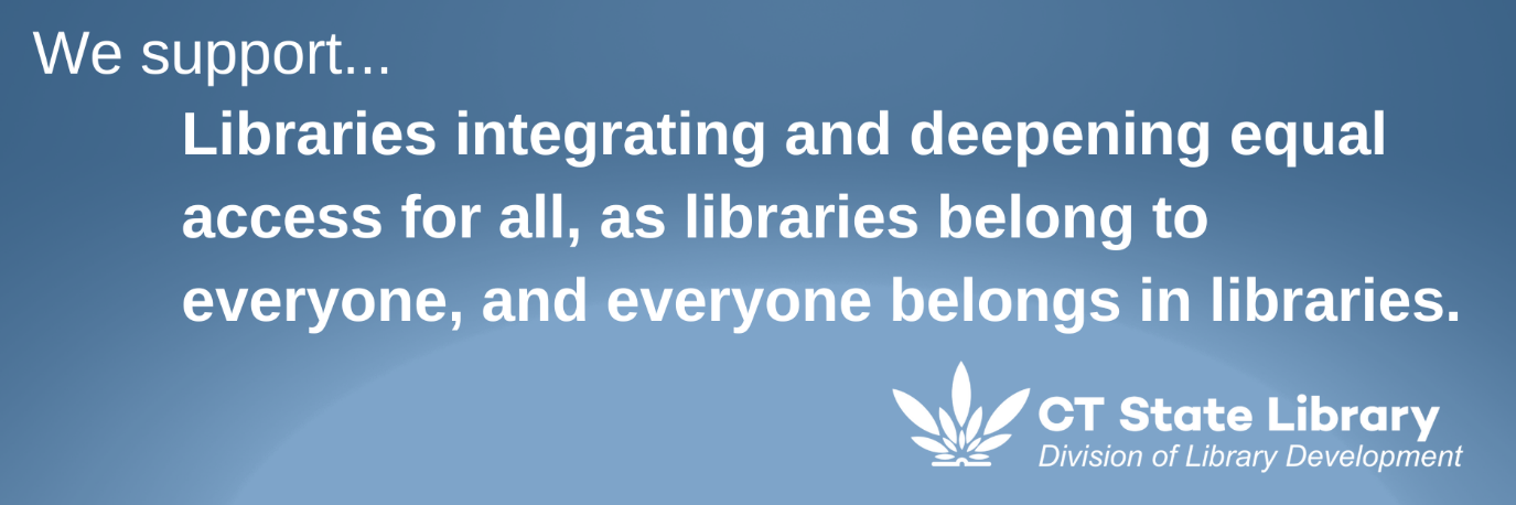 [Graphic with text: We support... Libraries integrating and deepening equal access for all, as libraries belong to everyone and everyone belongs to libraries. Logo: CT State Library Division of Library Development.]