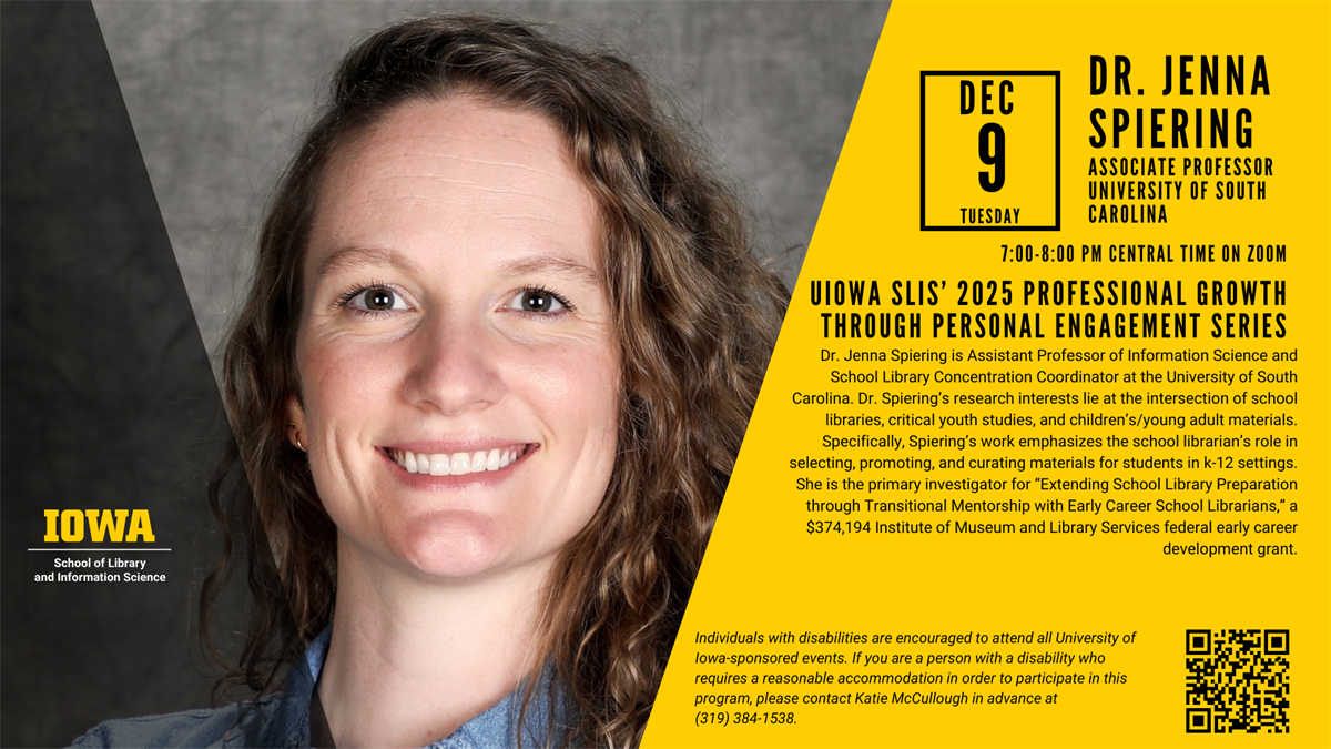 Hi Everyone,See you tomorrow night, Tuesday, December 9, 2025 at 7 pm CT/ 8 pm ET, for the fourth 2025-2026 UIOWA SLIS Professional Development Series "Professional Growth Through Personal Engagement" session featuring Dr. Jenna Spiering on "Advocacy Through Research on School Libraries." This will be our last session for the Fall semester.
