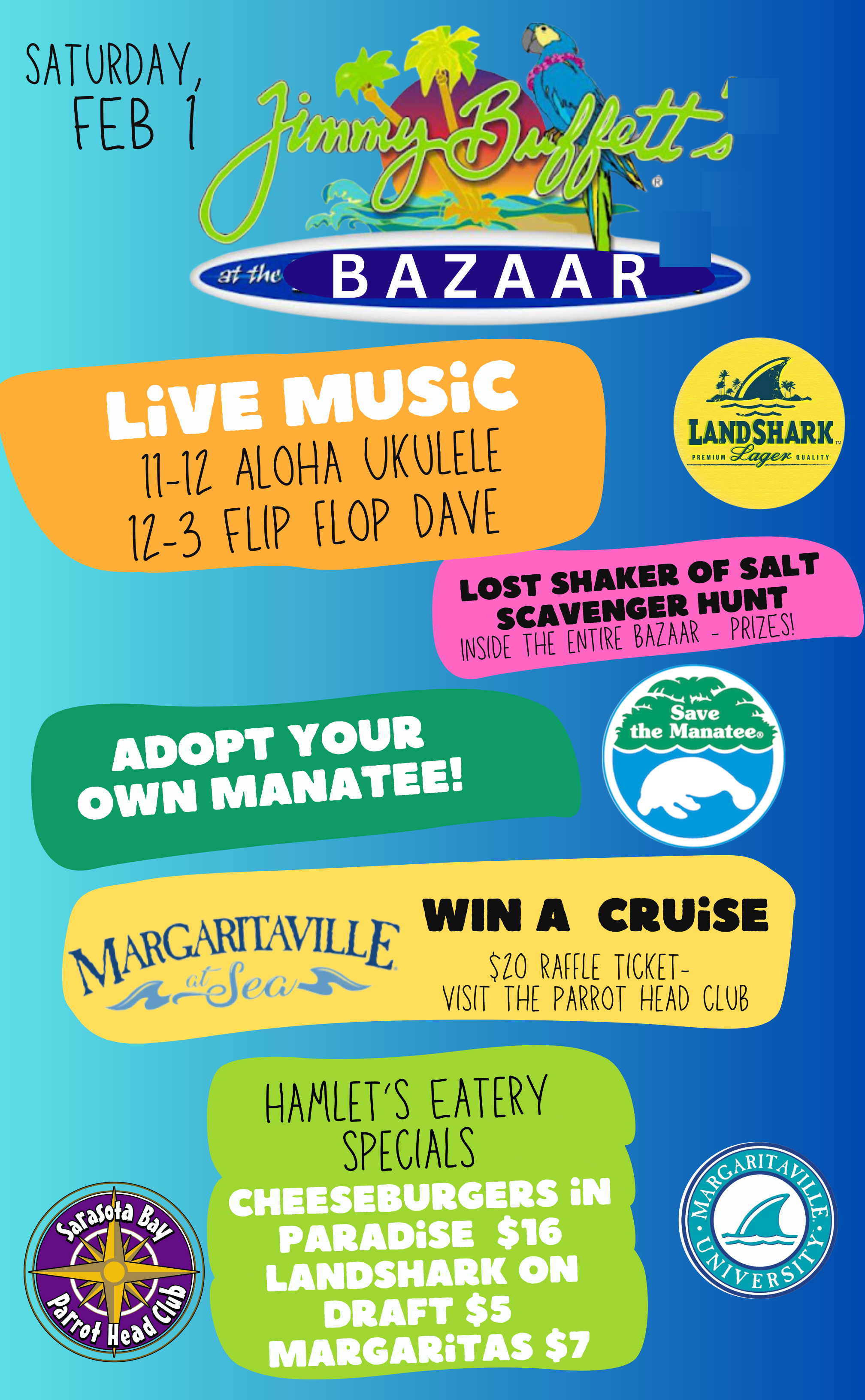 Looking for a PHun event this weekend? Join the Sarasota Parrot Head Club for Jimmy Buffett's at the Bazaar 2/1/25.